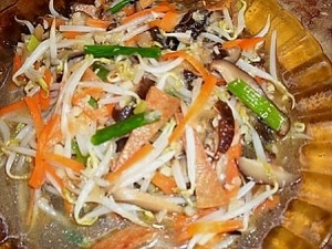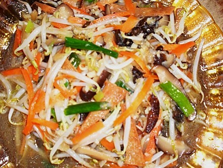 黑木耳,冬粉,香菇,罐头鲍鱼菇,蒜头,腐竹,红罗卜丝.高丽菜.记得,腐竹要切成一小片,然后下锅油炸.记得,油不要太热,火要关小.不然,你的腐竹会炸焦的.炸到金黄色就可以了.装在碗中备用.