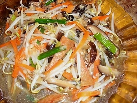 还有,香菇,黑木耳,冬粉.都要浸水的.浸到软就可以了.这样一来,香菇和黑木耳才好切丝吗.还有,就是冬粉也要浸水.除了高丽菜要浸久一点,其它的十五分钟左右就可以了.当这些香菇和黑木耳吸收水份后,会膨胀而变软.你就可以拿来切丝了.然后,装在小碗里备用.